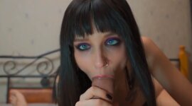 Брюнетка з готичним макіяжем насамперед бере в рот твердий член хлопця і робить йому прекрасний мінет. Ця чорноволоса бестія доставляє задоволення і дуже сексуально дивиться бойфренду в очі. А потім мініатюрна крихітка вже відсуває трусики в сторону і сідає на його фалос поголеною кицькою, займаючись сексом в позі наїзниці. Ця дівчина отримала задоволення і попросила залити спермою її личко.