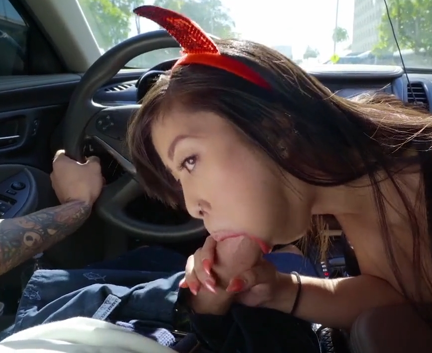 Чарівна крихітка на ім'я Jade Kush просто обожнює вбиратися в різноманітні костюми, від цього дівчина по-справжньому фанатіє і іноді так вживається в роль, що просто не може контролювати свої дії. Сьогодні красуня в цьому гарячому костюмі вийшла ловити попутку, адже їй потрібно було доїхати до місця, де проходить вечірка. Красуня зупинила машину і залізла до незнайомця в салон, хлопець, побачивши цю сучку, був тільки радий підвезти її, адже він сподівався на дещо. Красуня була явно не проти догодити самцеві, вона дістала його твердий пеніс і почала робити хлопцеві мінет прямо в салоні машини. Красуня зробила хлопцеві відмінний мінет, але явно хотіла більшого. Хлопець вирішив зупинитися де немає людей, щоб продовжити розважатися з цією сучкою. Парочка вийшла з машини і продовжила займатися сексом на вулиці, хлопчина встромив свій твердий пеніс в тугу кицьку красуні і почав жорстко натягувати красуню, змушуючи її голосно стогнати. Хлопець як слід виебав азіатську малу і в самому кінці закінчив дівчині прямо на її миле личко.