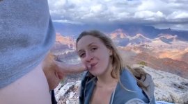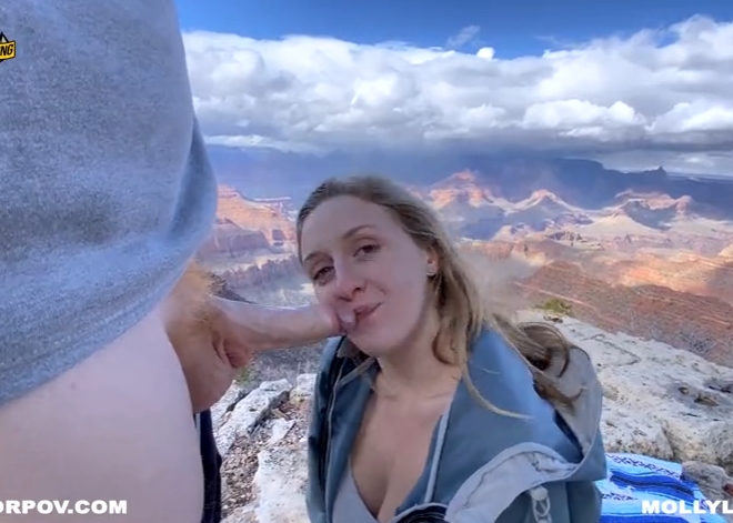 Симпатична дівчина з соковитими цицьками мандрує зі своїм рудим хлопцем у горах, милуючись краєвидом великого каньйону і високих гір. Знайшовши затишну галявину з красивим видом, дівчина захотіла трохи побешкетувати. Постеливши на землю покривало, вона стає на коліна і знімає з хлопця шорти, оголивши його волохатий член з рудим волоссям. Дивлячись чоловікові в очі, дівчина робить мінет на природі, заковтуючи великий член глибше в рот.